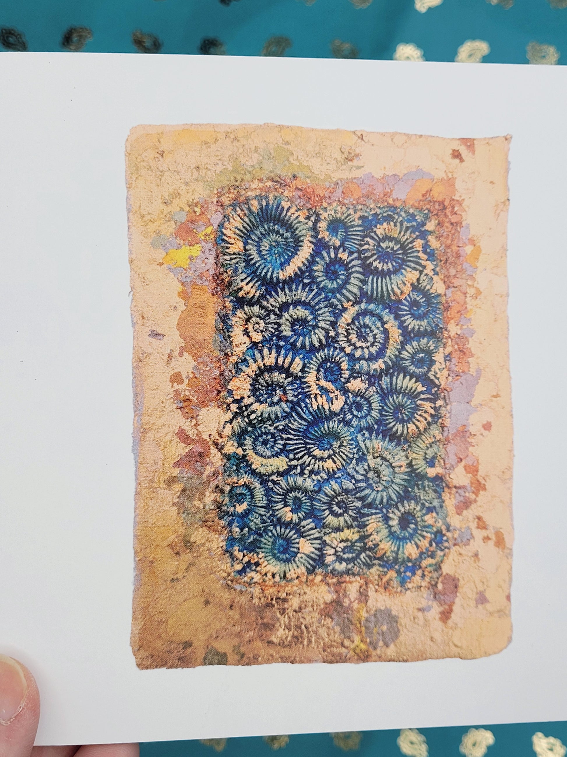 Printed from a photo of a unique, vibrant, 3d copper leaf and blue paint artwork I created.