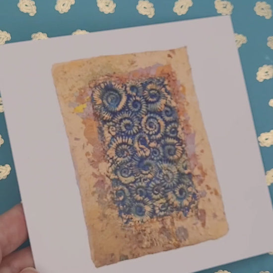 Blank inside with "Ammonite Assemblage, by Cat Finlayson 2024. Paper Clay, acrylic paint, and copper leaf on canvas. Body Painting By Cat.com" on back.