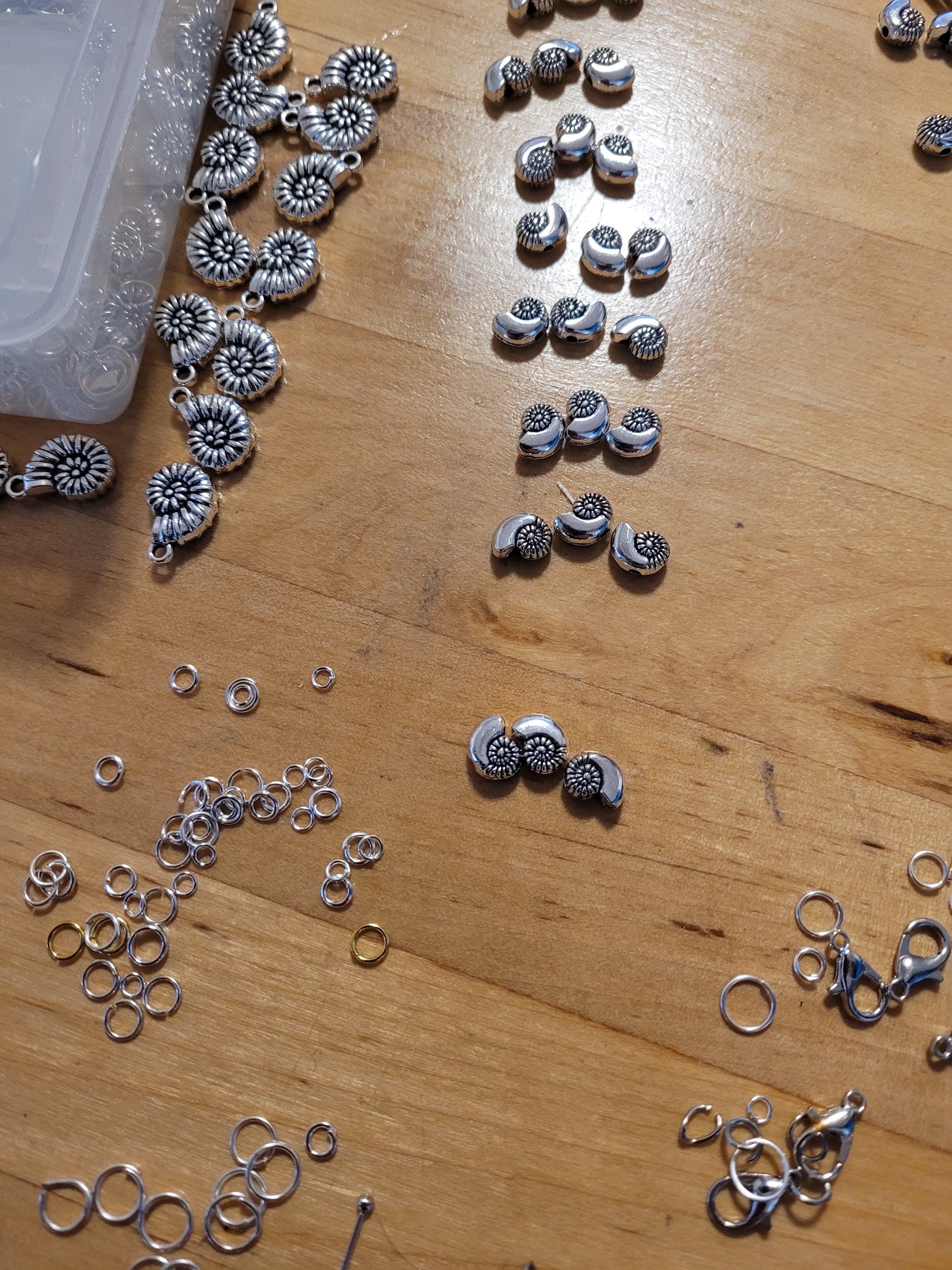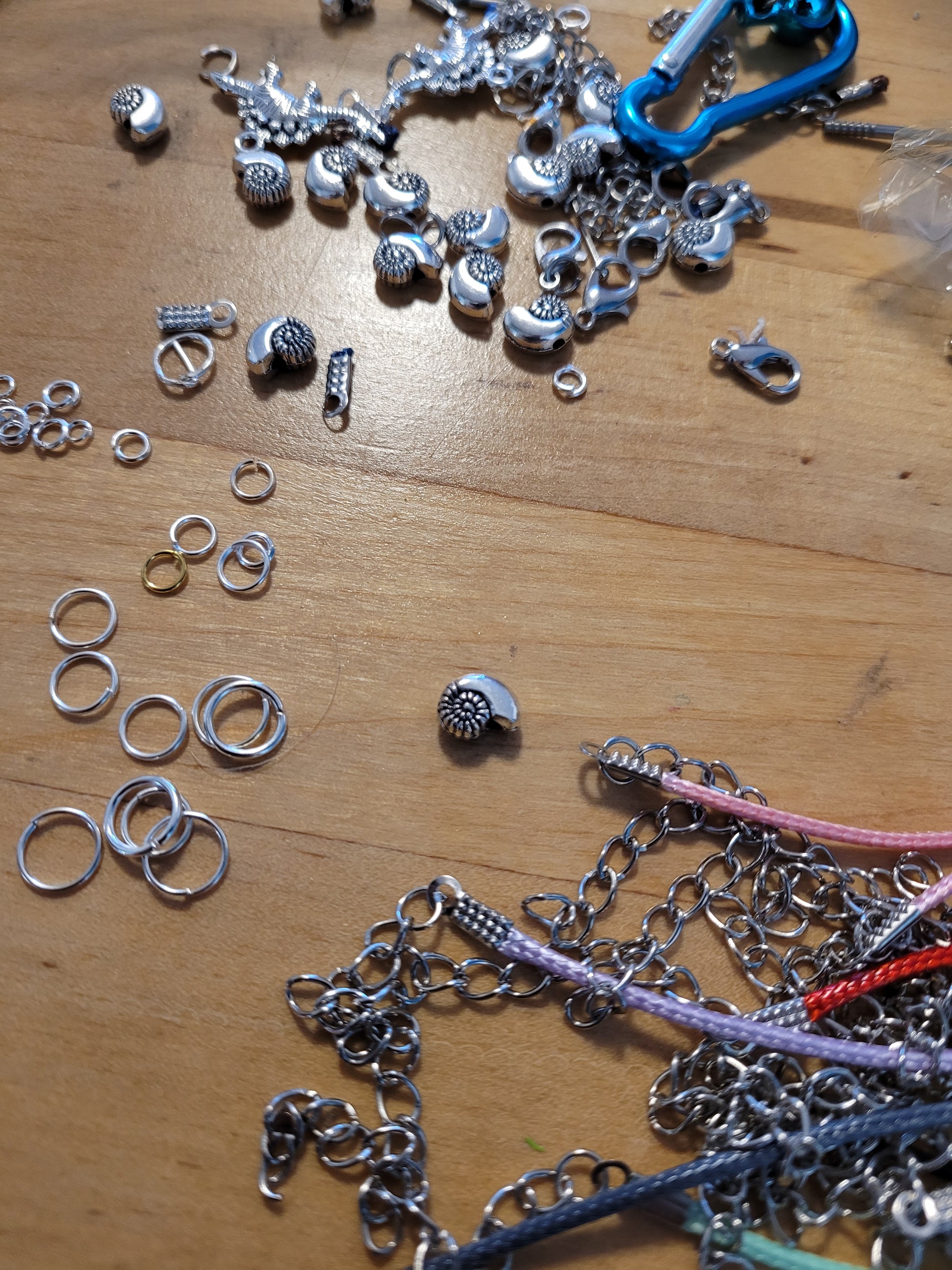 Simple, tiny ammonite snail beads threaded onto a silver pin and wrapped to dangle from a thong.