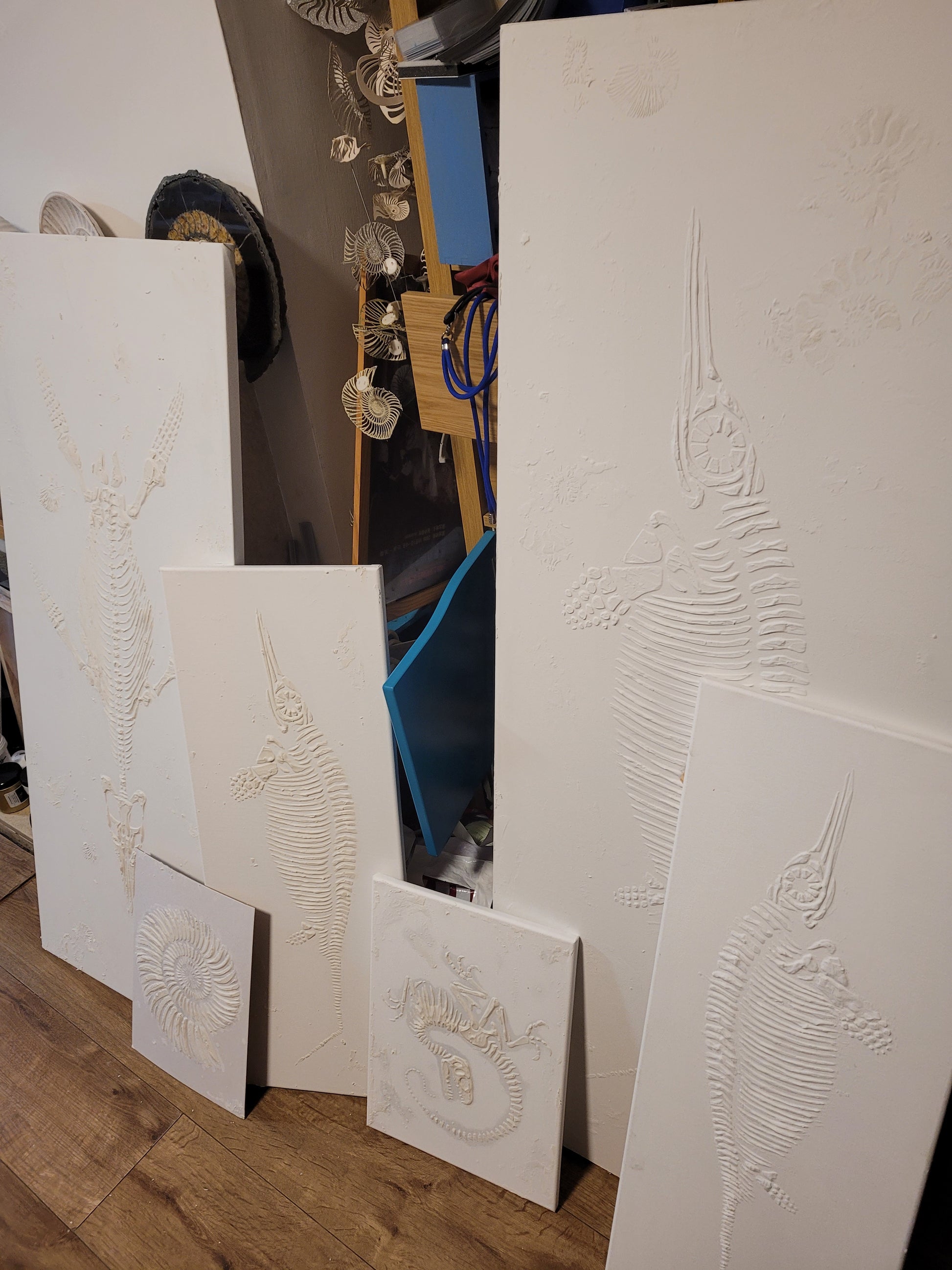 I sculpt plaster onto board, canvas, directly onto walls, wardrobes, boxes etc.