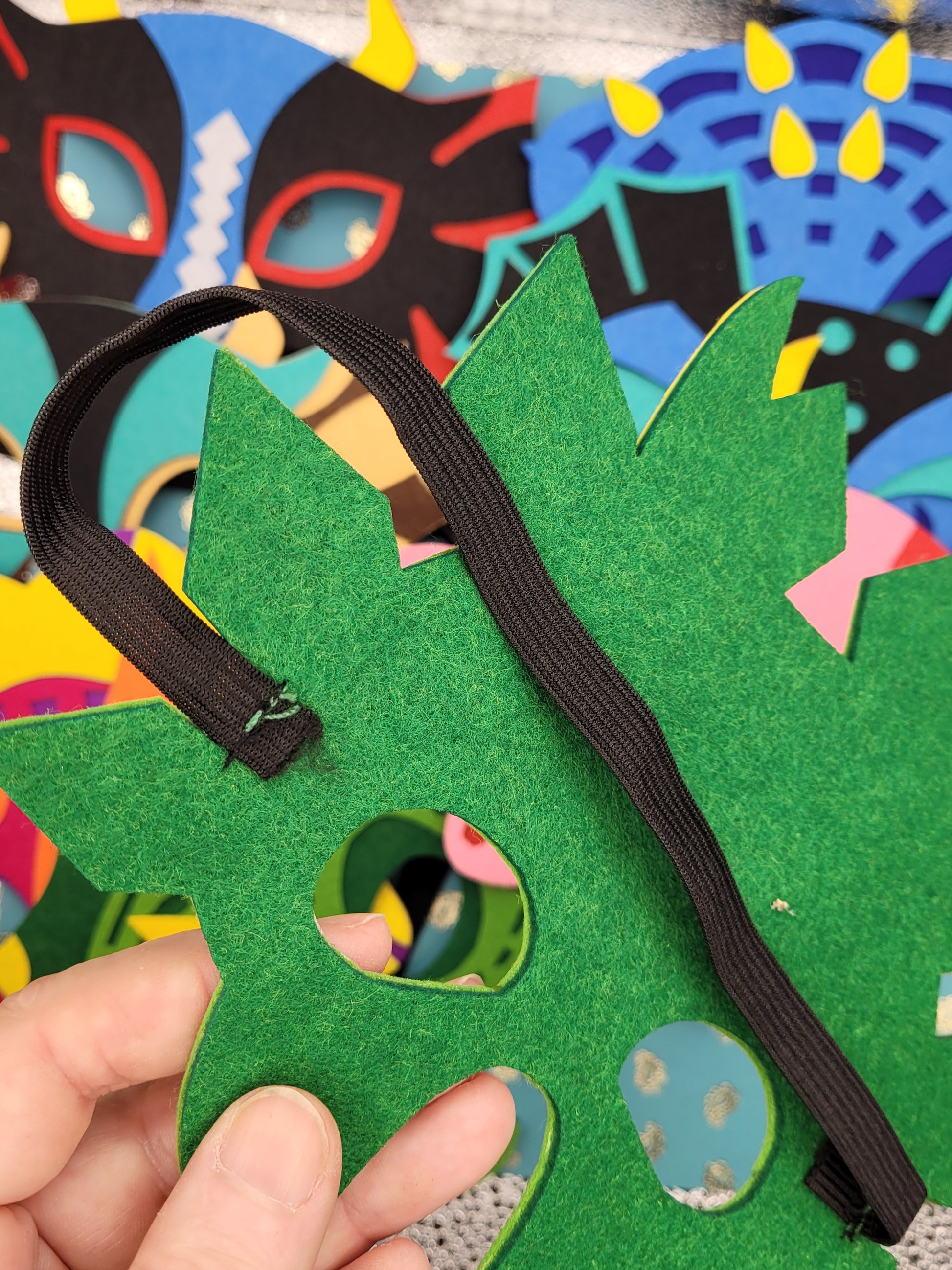 Elastic is sewn in, felt is well glued on. I have my set strung up like bunting/ high on nails to decorate parties, and my son's bedroom.