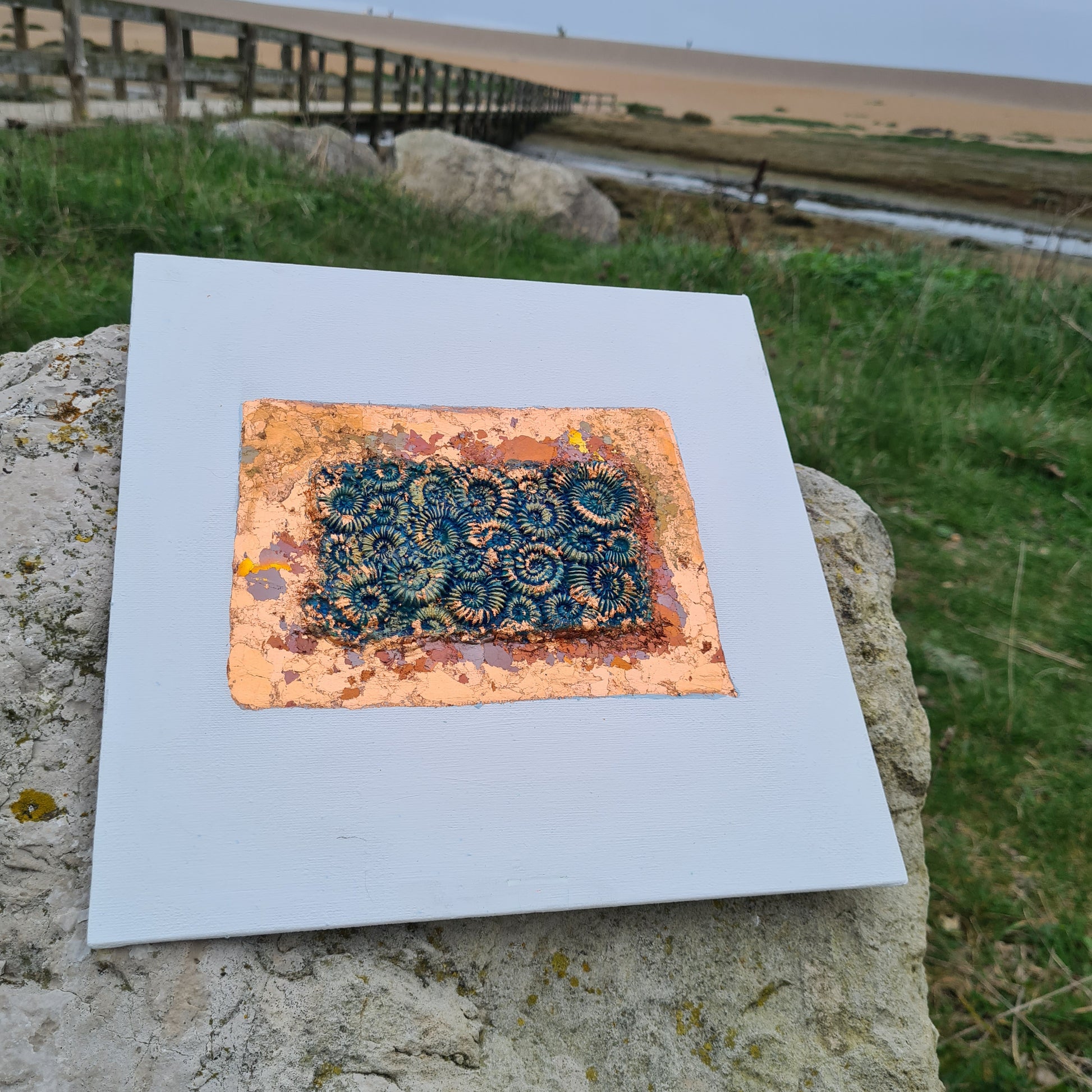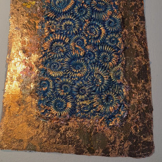 Colourful copper and other shades of metallic foil, glided onto hand-painted paper-clay moulded ammonites.