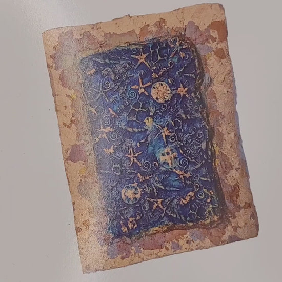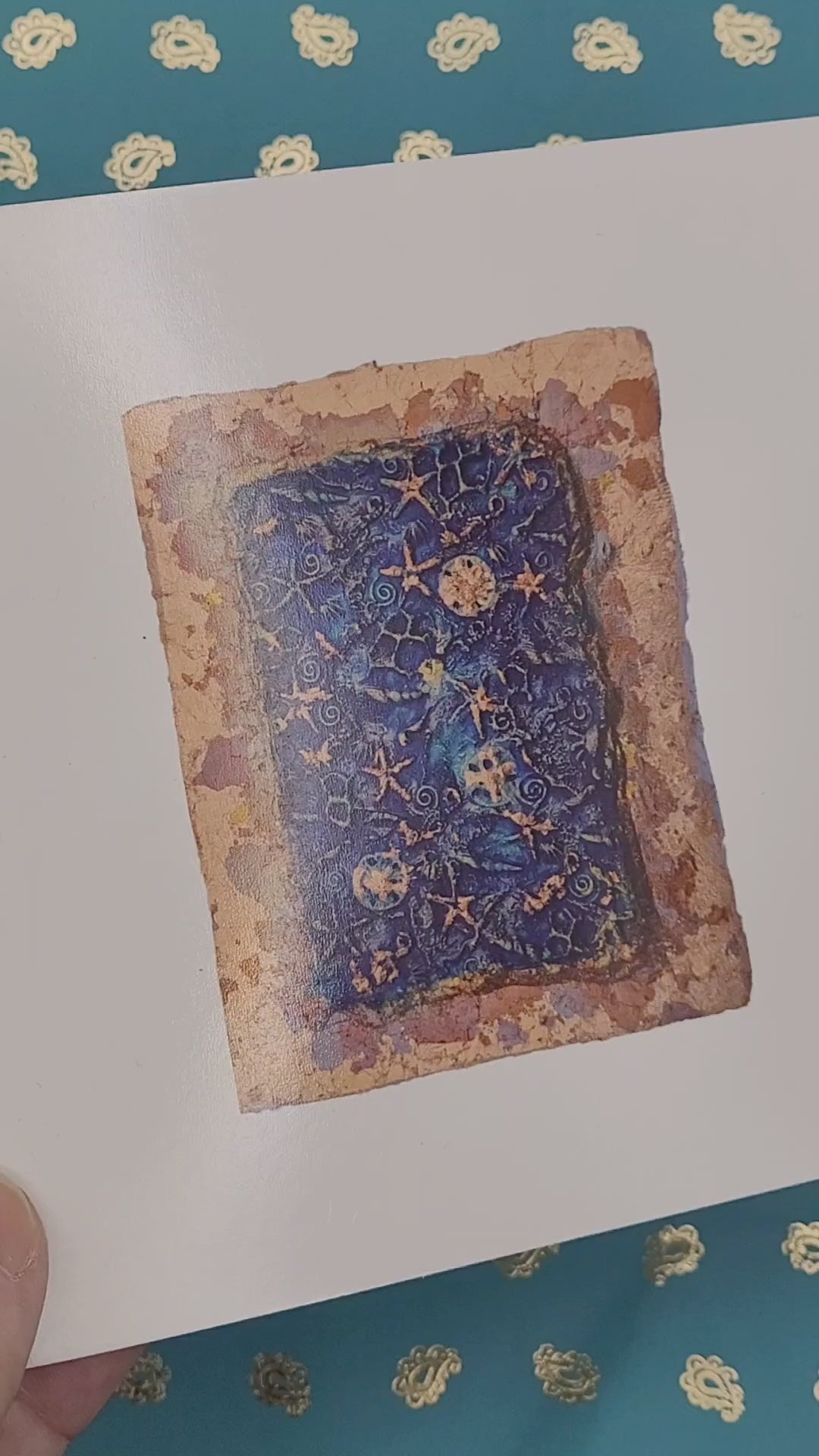 Printed from a photo of a unique, vibrant, 3d copper leaf and blue paint artwork I created