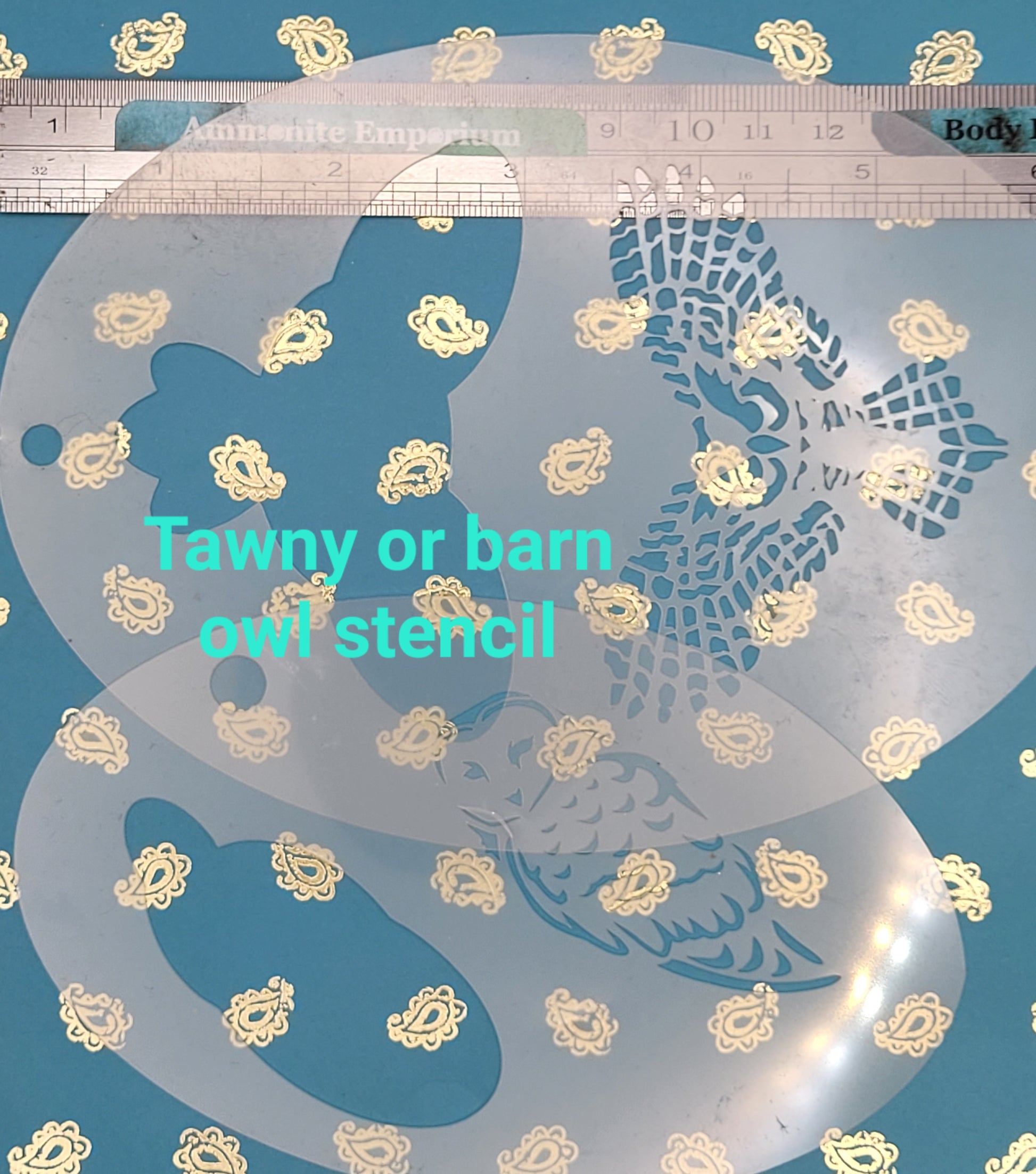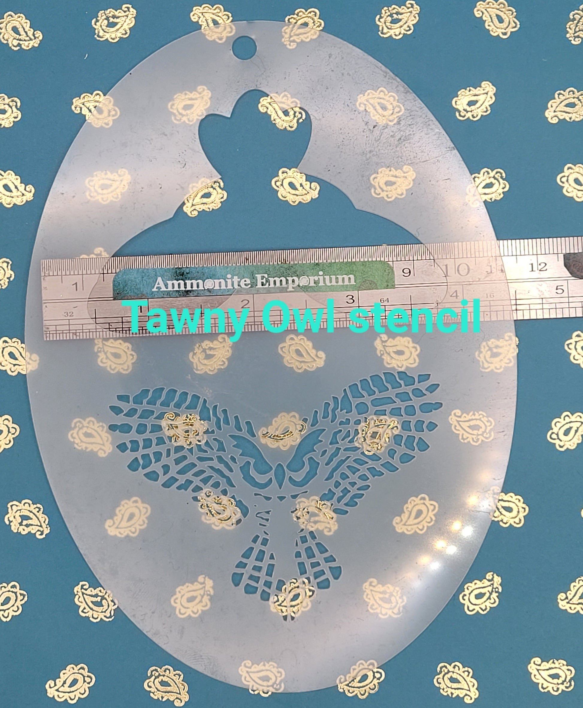 A realistic tawny owl flying stencil. 2 parts in 1 handy stencil, so sponge white through the larger hole shape as a base and add the darker blacks or browns on top with the pattern stencil.