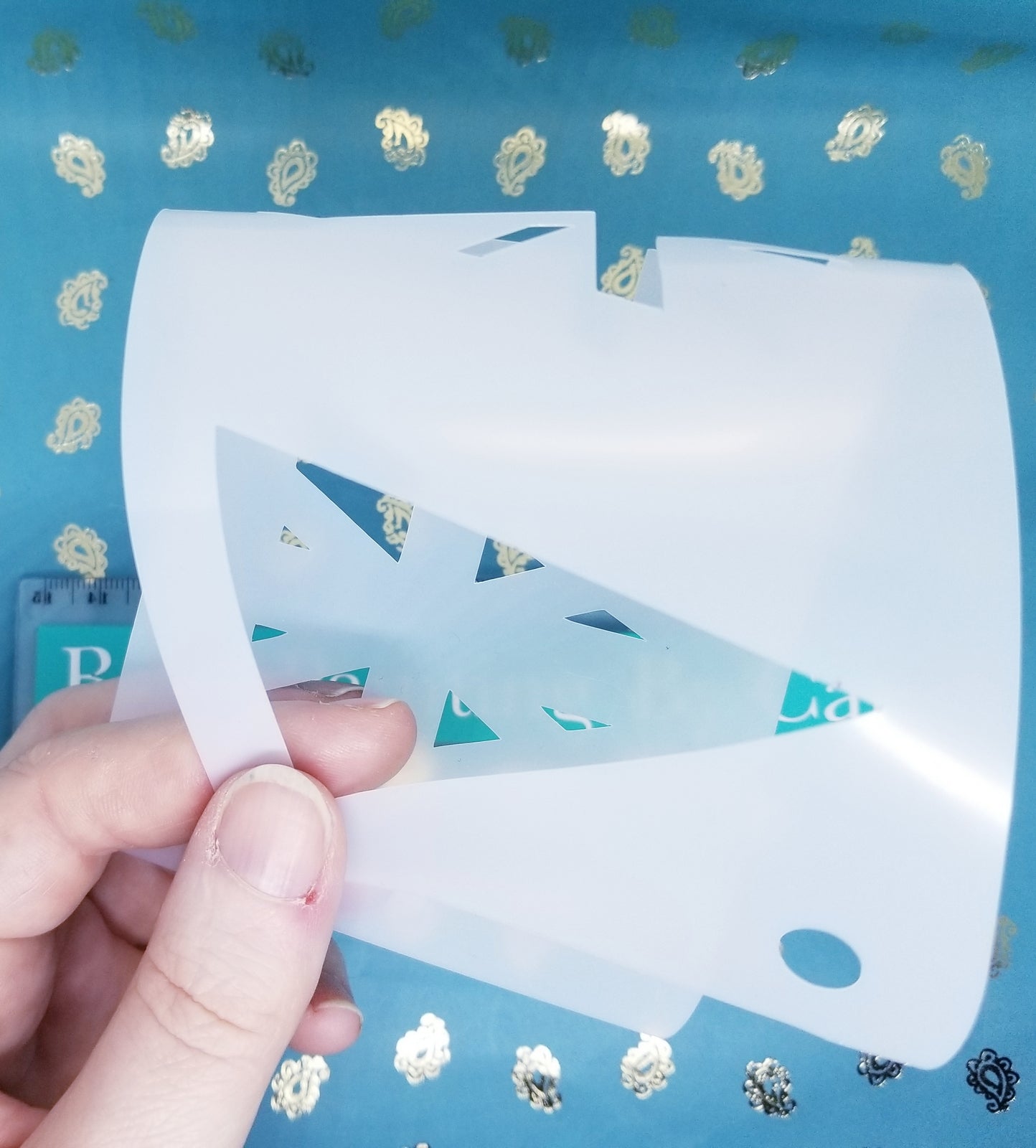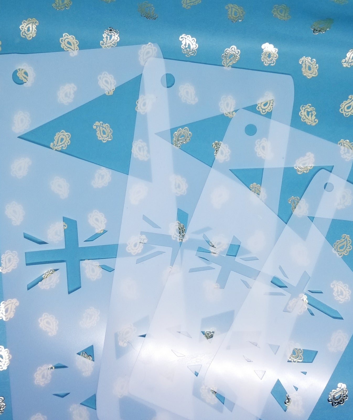 Larger sizes will not be in a strip but in a sheet or sheets. In the painted examples the rectangle & heart are from the smallest 2 inch size, the triangle is from the 2.5 inch stencil.
